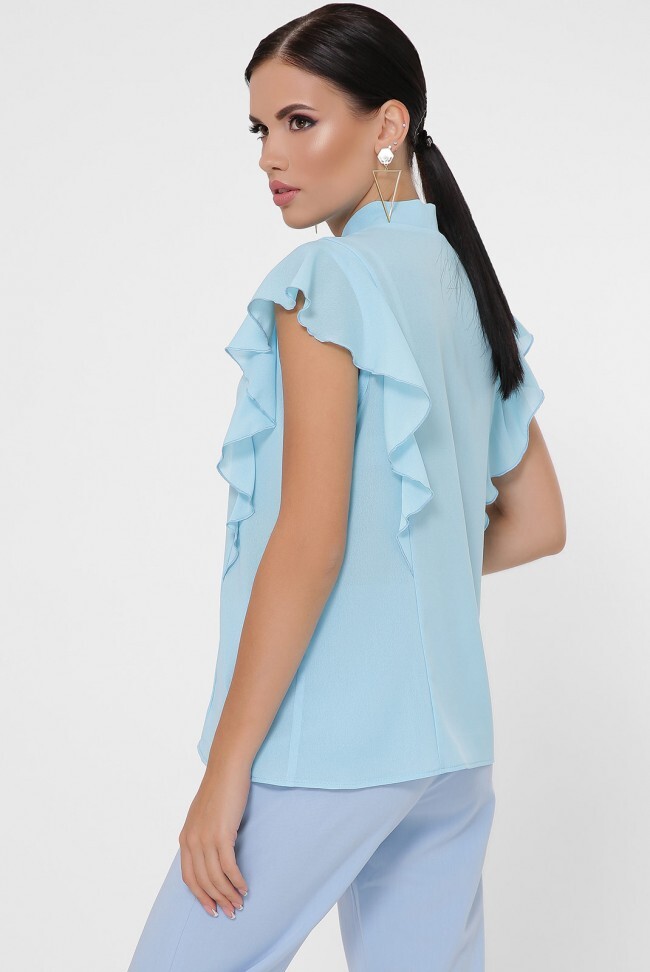 Блуза "Peony" свободного кроя с оригинальным воротником-галстуком. По переду и по спинке полочки разрезаны от плеча до низа и в эти швы вставлены рюши-крылышки. Длина блузы - 61 см Ширина рюши на плече - 11 см Полуобхват груди - 47 см Длина завязок - 60 см Ширина завязок - 3 см