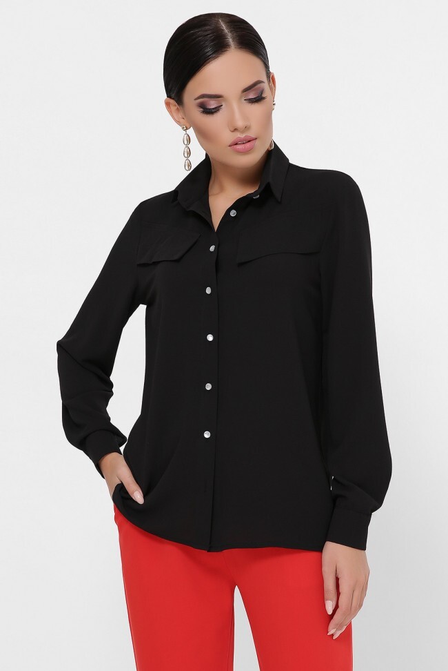 Черная однотонная блуза рубашечного кроя, декорированная клапанами на груди. Блузка сшита из легкого креп шифона. Замеры в (42) размере: длина блузки 63 см, длина рукава с манжетой 59 см, ширина манжеты 5 см, полубхват груди 48 см.