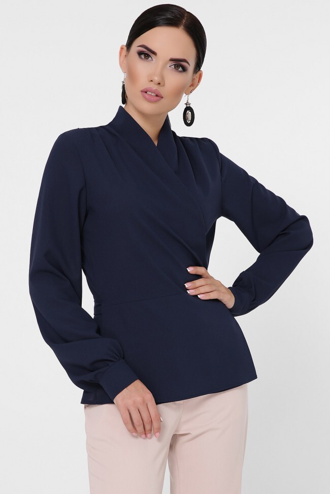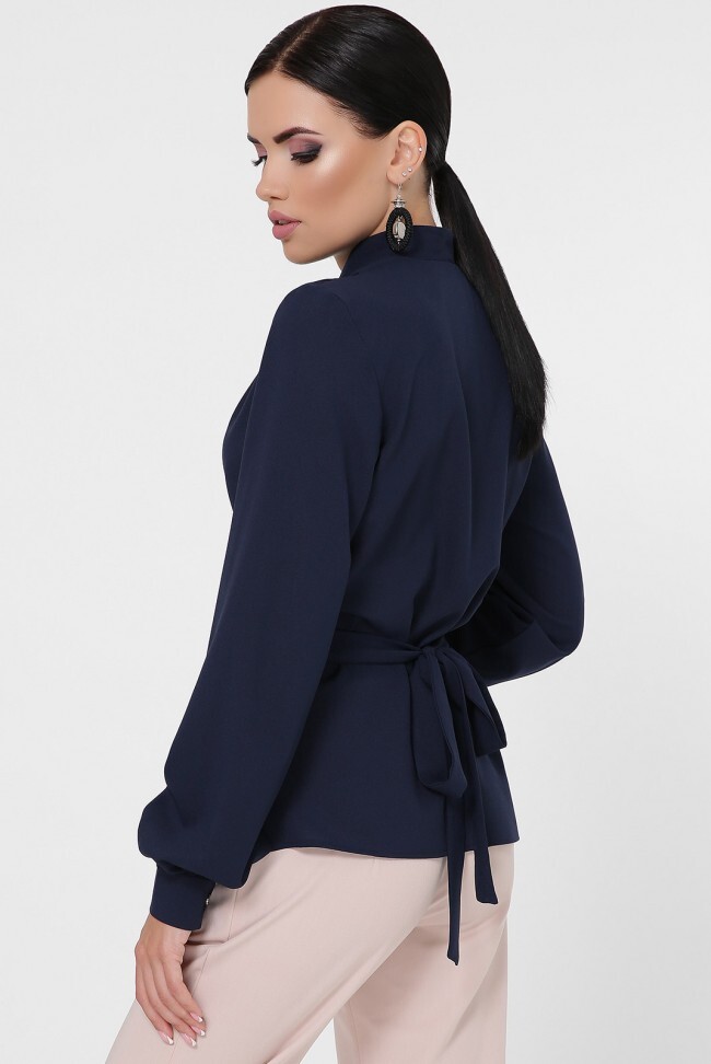Эффектная темно-синяя блуза на запах. Плечи блузы по переду и рукава снизу присборены. Сзади блузка завязывается на пояс. Длина блузы - 62 см Длина рукава с учетом манжета - 65 см Ширина манжета - 5 см