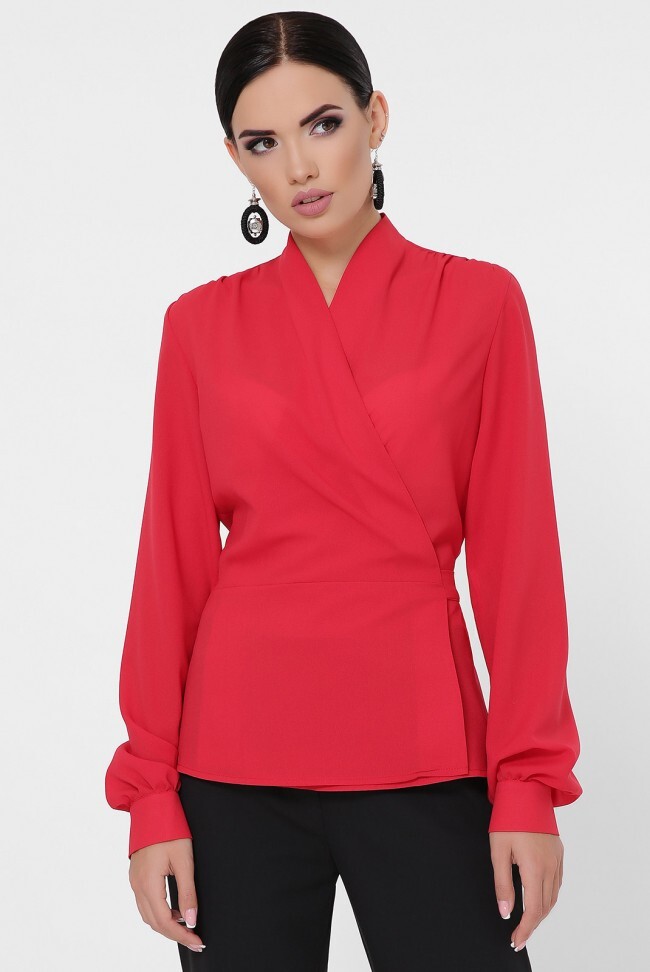 Элегантная красная блузка на запах с длинными рукавами. Плечи блузы по переду и рукава снизу присборены. Сзади блузка завязывается на пояс. Длина блузы - 62 см Длина рукава с учетом манжета - 65 см Ширина манжета - 5 см