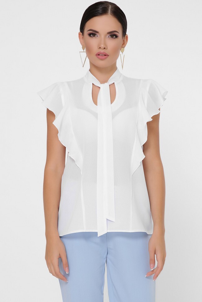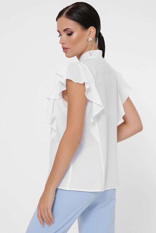 Блуза "Peony" свободного кроя с оригинальным воротником-галстуком. По переду и по спинке полочки разрезаны от плеча до низа и в эти швы вставлены рюши-крылышки. Длина блузы - 61 см Ширина рюши на плече - 11 см Полуобхват груди - 47 см Длина завязок - 60 см Ширина завязок - 3 см