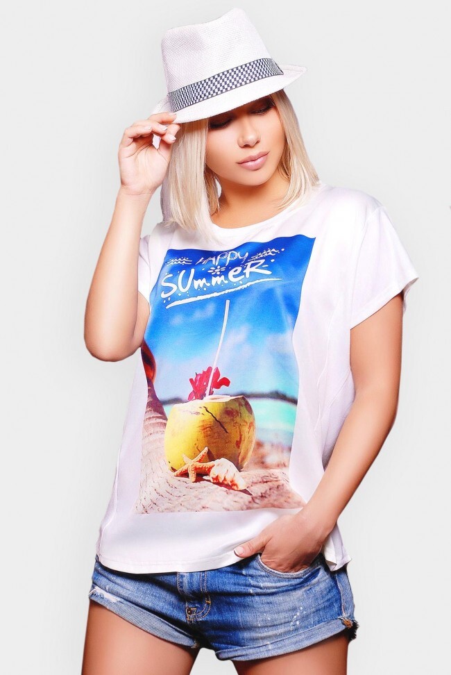 Солнечная футболка "Air" - стильное пополнение новой летней коллекции. Изделие с коротким рукавом представлено из двух легких материалов: креп шифона и мягкой вискозной ткани. На передней полочке выполнена сублимация в виде красочного морского принта "Happy summer". Свободный фасон скроет мелкие недостатки Вашей фигурки.