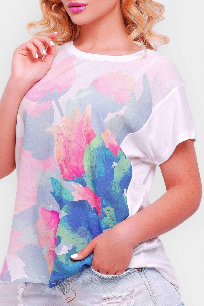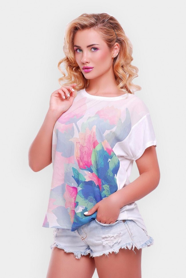 Модная женская футболка "Air" подарит Вам ощущение легкости и комфорта. Полка выполнена из креп-шифона в нежным цветочным принтом, спинка — вискоза белого цвета. Ткань прекрасно драпируется, отлично пропускает воздух и впитывает влагу. Кроме того, в отличие от обычного шифона, не просвечивает. Модель выполнена с коротким рукавом и горловиной лодочкой, не садится при стирке и не выгорает на солнце, а главное — не образовывается катышков и удивительным образом отталкивает грязь. Современная футболка "Air" — комфортна и практична в повседневной носке.Длина по спинке - 65 см, по переду - 55 см.