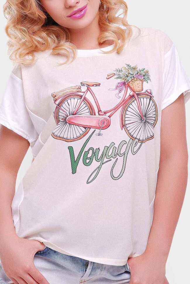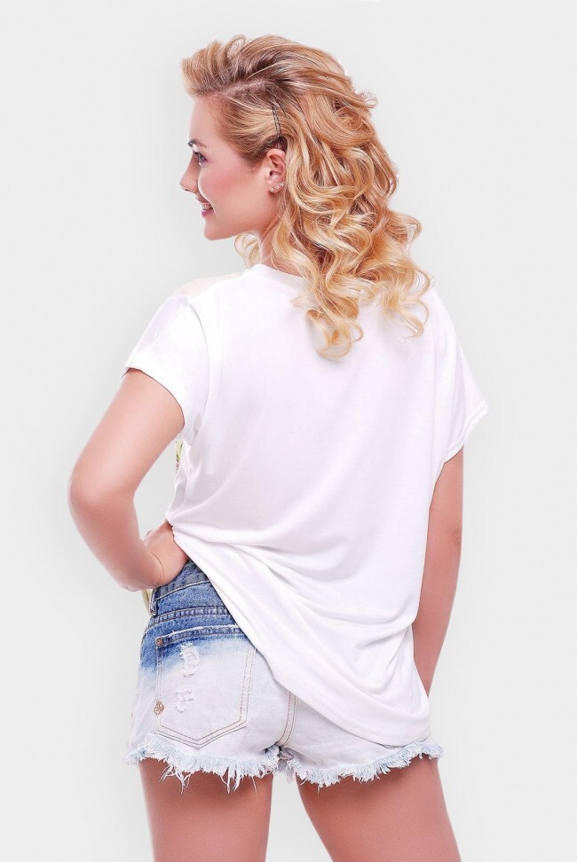 Летняя женская футболка "Air" — прекрасный вариант для повседневной носки в жаркую погоду. Полка выполнена из белого креп-шифона с принтом и надписью, спинка — вискоза, так же белого цвета. Оба материала прекрасно пропускают воздух и впитывают влагу, отлично драпируются, не садятся при стирке, а рисунок не выгорает на солнце. Для принта использована уникальная технология печати, при которой краски наносятся не сверху, а проникают в волокна ткани, что позволяет сохранить рисунок при различных внешних раздражителях. Стать нежной и неотразимой легко — достаточно надеть летнюю футболку "Air". Длина женской футболки: по спинке - 65 см, по переду - 55 см.