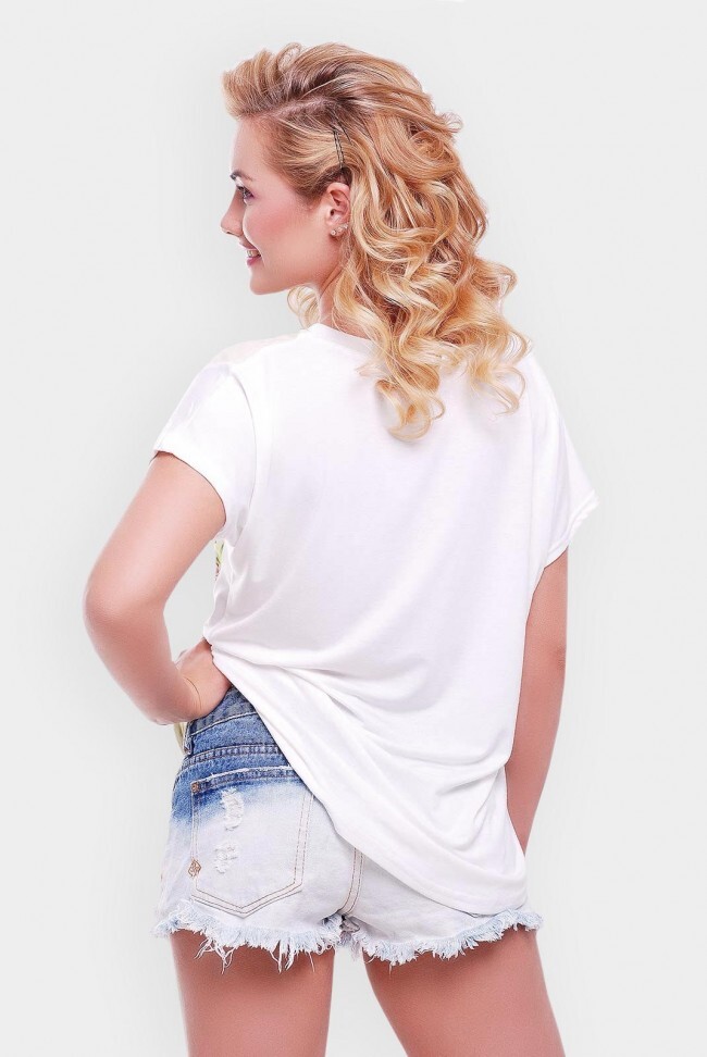 Молодежная футболка "Air" — отличное сочетание цены и качества! Благодаря тому, что нанесенный на креп-шифон принт имеет уникальную технологию печати, со временем краски не перестанут быть яркими, а сам материал не сядет и не покроется ненавистными катышками. Спинка — белая вискоза, материал отлично пропускает воздух, легко впитывает влагу и довольно быстро сохнет. Но главное — ее удивительное преимущество отталкивать грязь, поэтому, надев футболку для активного отдыха, девушка не будет переживать из-за ее белого цвета. Длина молодежной футболки: по переду - 55 см, по спинке - 65 см.