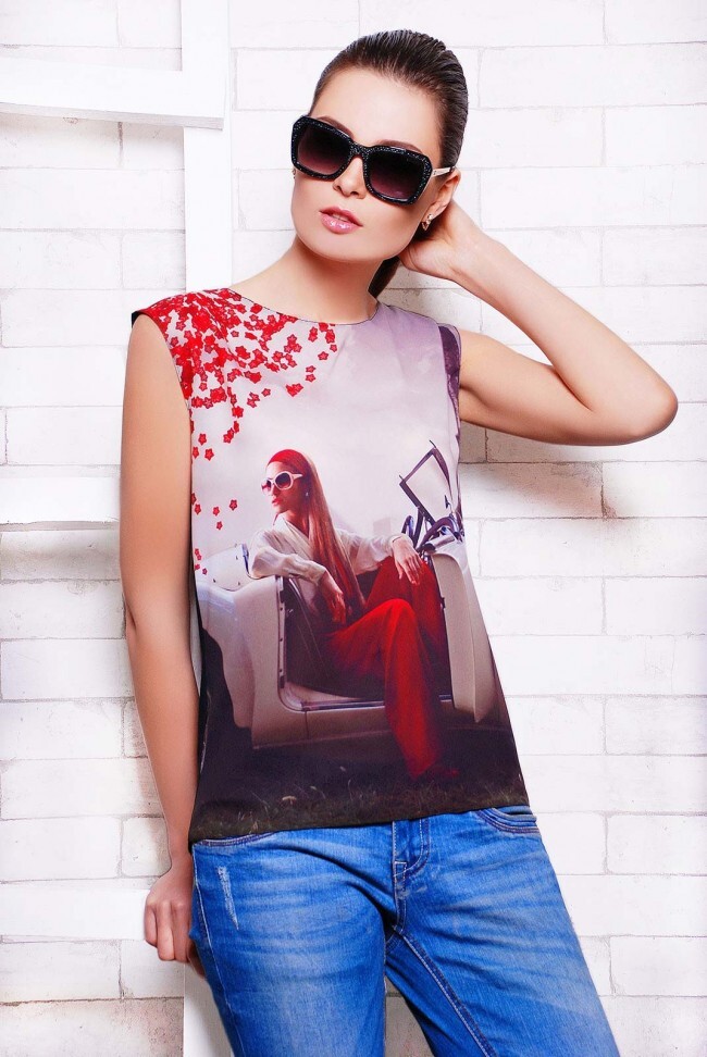 Стильная, молодежная футболка "Classic" прямого, непринужденного покроя. Изделие без рукавов с круглым горловинным вырезом. Передняя полочка, оформленная эпатажным принтом "Девушка в машине" выполнена из качественного, легкого креп шифона, а спинка классического черного цвета - мягкая вискозная ткань. Длина футболки: 60 см
