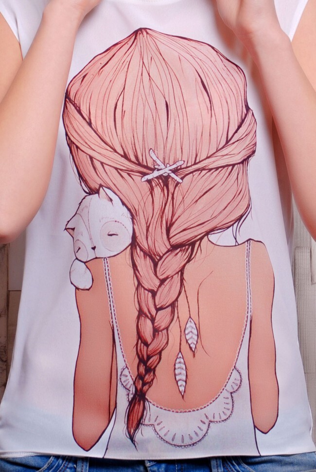Молодежная футболка "Classic" прямого, свободного покроя с круглым горловинным вырезом. Модель без рукавов. Выполнена футболка комбинацией двух приятных, легких тканей: креп шифон и вискоза. Спереди оформлена необычным принтом "Девочка с котиком". Длина футболки: 60 см