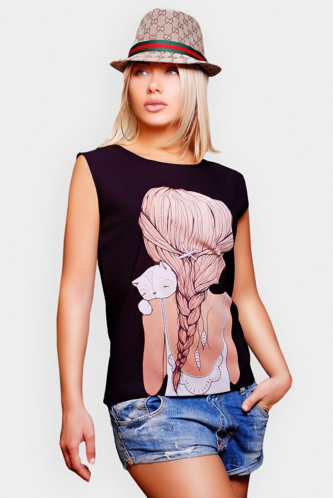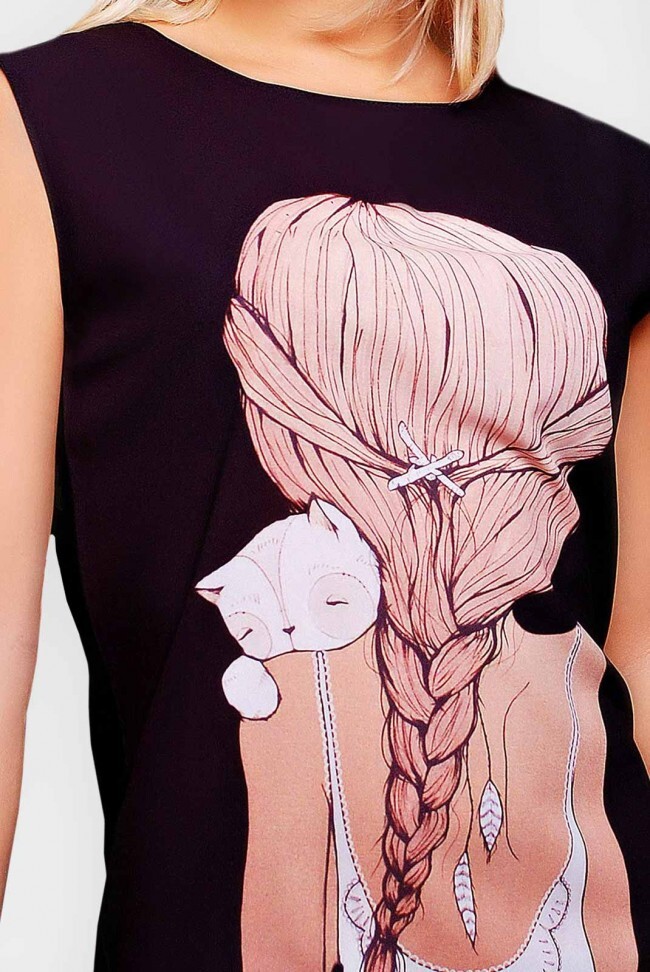 Привлечь внимание окружающих поможет стильная футболка "Classic" с экстравагантным принтом "Девочка с котиком". Классический фасон и черный цвет модели позволят Вам создавать интересные образы в паре с джинсами, шортами, юбками, леггинсами, пиджаками. Выполнено изделие комбинацией двух тканей: креп шифон и вискоза. Длина футболки: 60 см