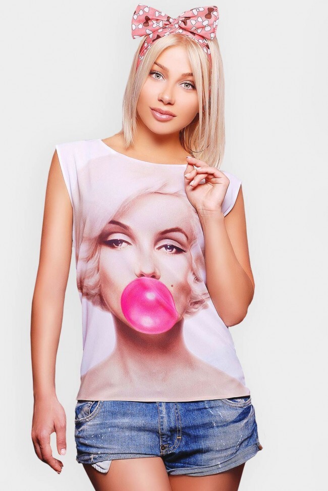 Стильная футболка "Classic" прямого, непринужденного покроя, без рукавов. Экстравагантная, яркая модель прекрасно подчеркнет ваш индивидуальный, неповторимый стиль. Передняя полочка выполнена из качественного креп шифона, оформлена эффектным принтом "Монро". Спинка из нежной вискозной ткани. Длина изделия по спинке: 60 см