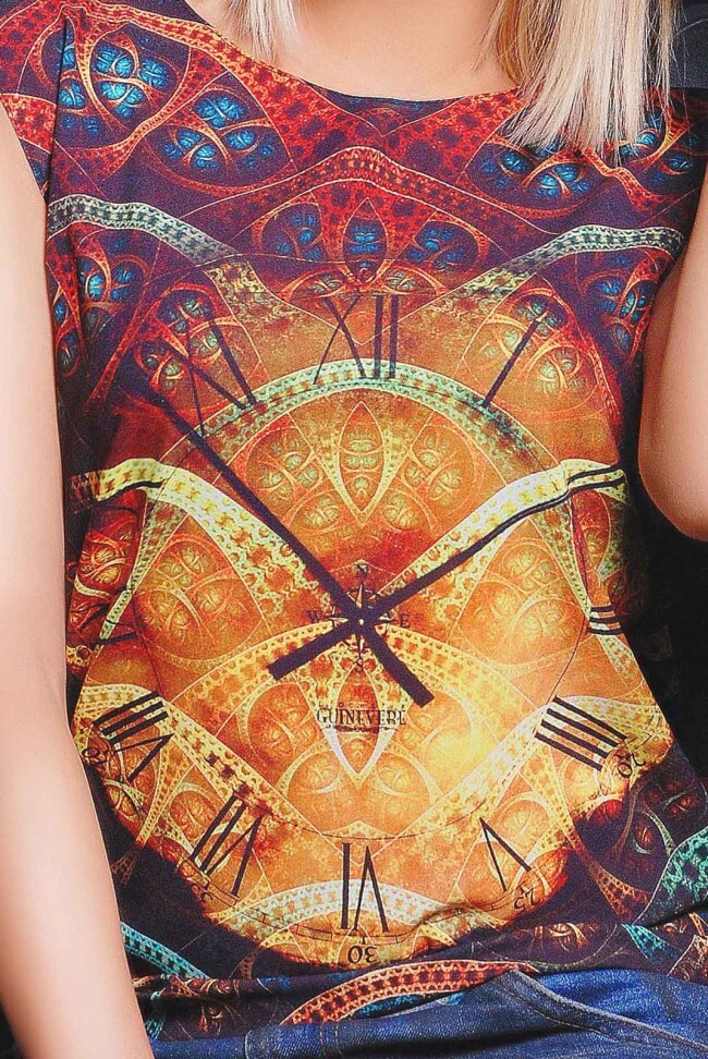 Стильная футболка прямого силуэта, выполненная из крепового шифона. Изделие с круглым вырезом горловины и рукавом, слегка прикрывающим плечо. Модель украшена принтом. Замечательный выбор для повседневного гардероба.