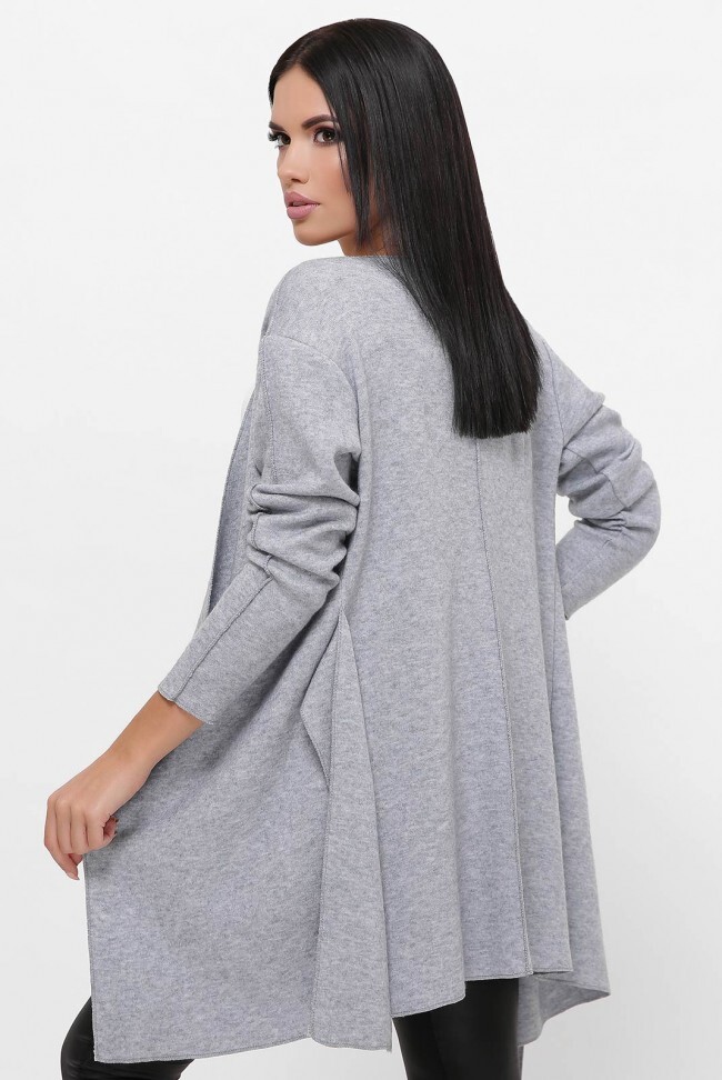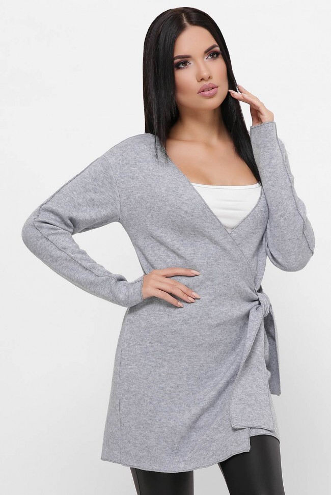 Теплый, воздушный кардиган на запах серого цвета. Обработка швов по краям открытая, вдоль спинки и вдоль рукава швы наружу. Замеры в (42) размере: от плечевого шва 79 см, рукава 55 см.