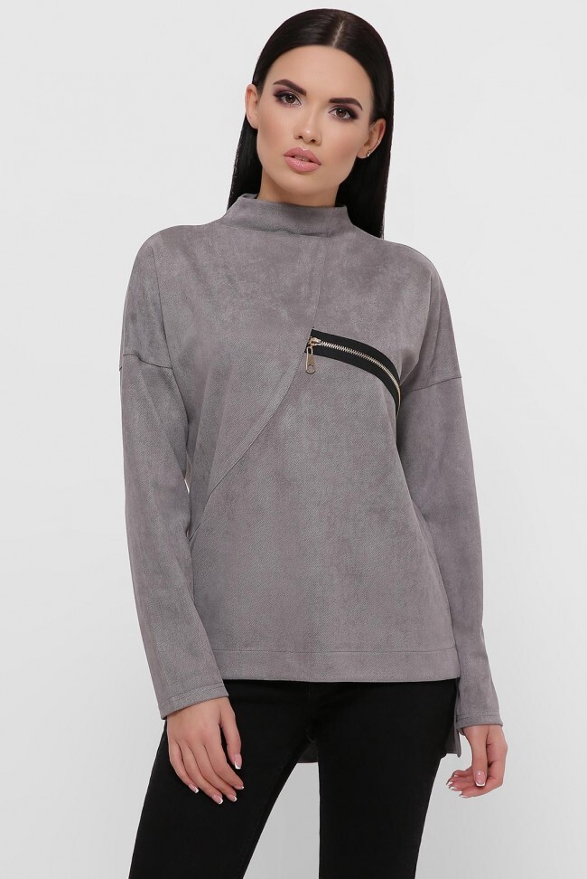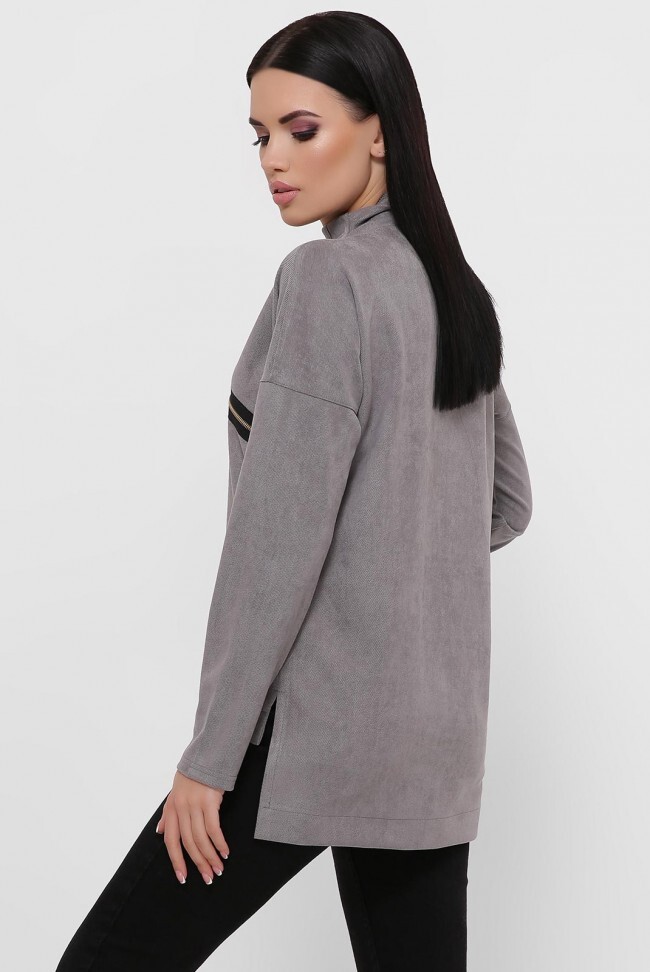 Женская замшевая кофта серого цвета с удлиненной спинкой и воротником стойкой. По переду кофты декоративный рельеф с накладной молнией на груди. Модель со спущенным плечевым швом - спереди кофта чуть короче, чем сзади. Замеры в (42) размере: длина по переду 64 см, по спинке 75 см, рукава 45 см.