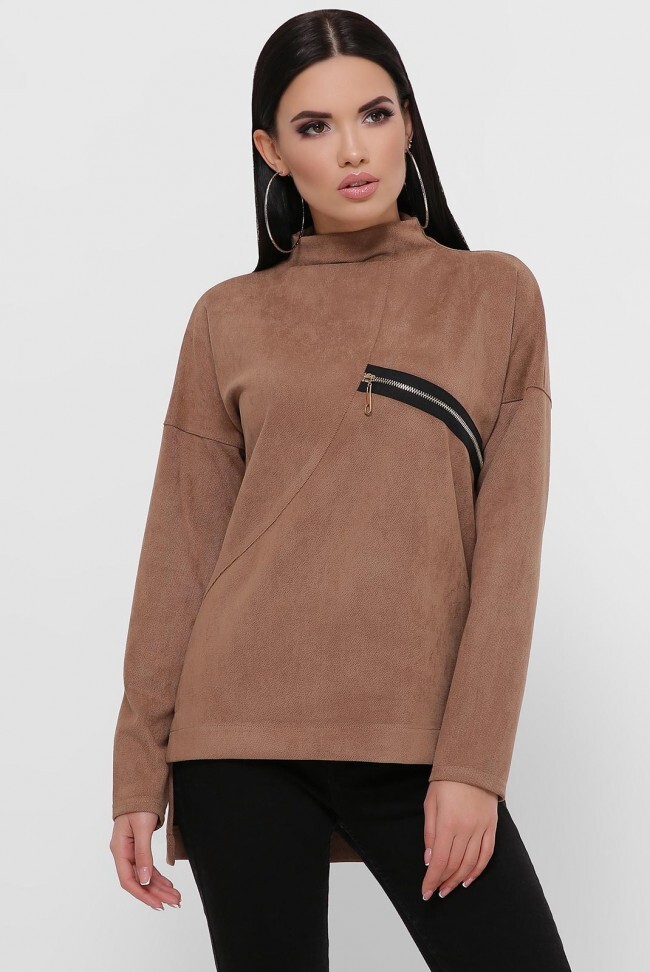 Женская замшевая кофта светло-коричневая с удлиненной спинкой и воротником стойкой. По переду кофты декоративный рельеф с накладной молнией на груди. Модель со спущенным плечевым швом - спереди кофта чуть короче, чем сзади. Замеры в (42) размере: длина по переду 64 см, по спинке 75 см, рукава 45 см.