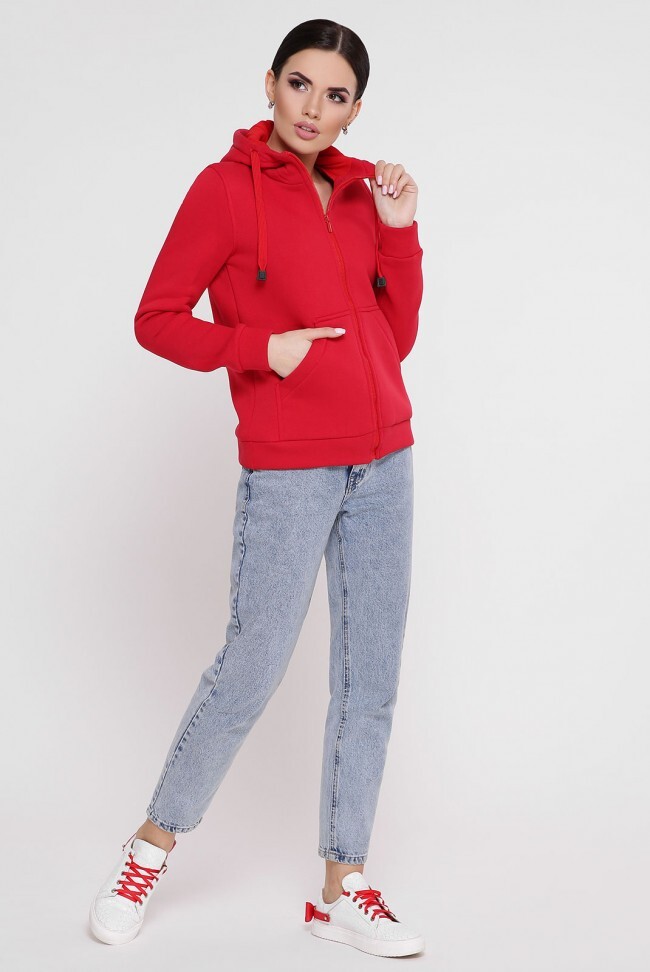Утепленная толстовка на флисе. Модель красного цвета с капюшоном и карманами кенгуру. На спинке - аппликация "звезда" из пайеток. Замеры в (42) размере: длина по спинке 60 см, длина рукава 63 см.