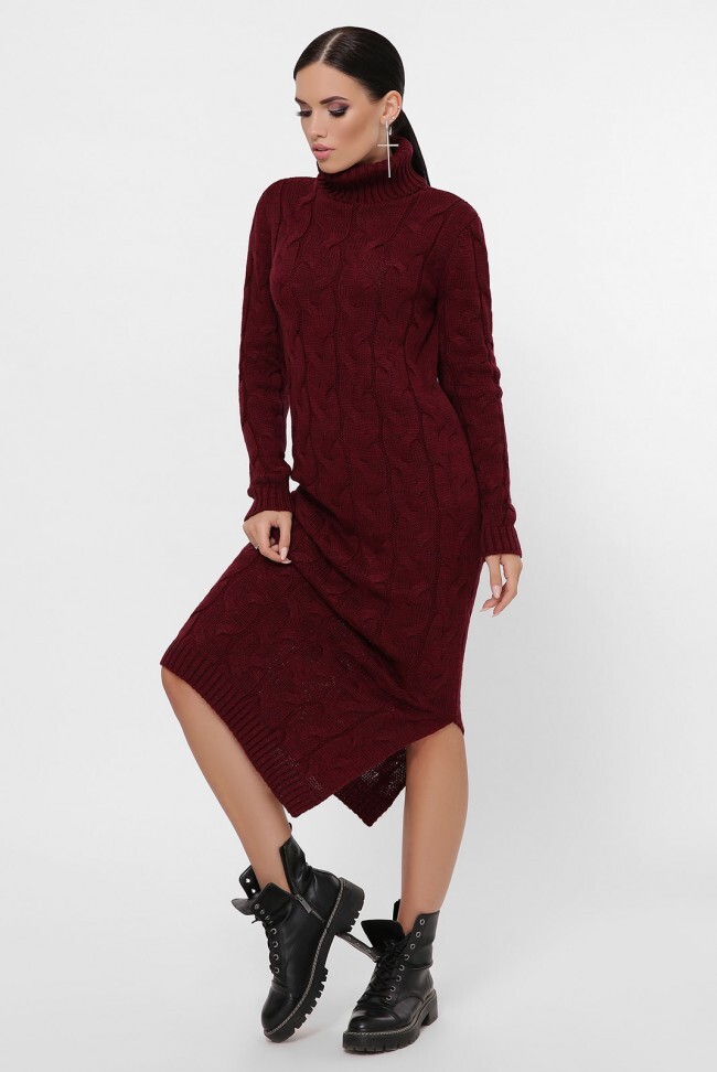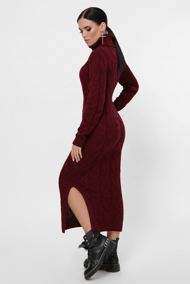 Марсаловое вязаное платье миди с высоким воротником и разрезом. Замеры в (42-48) размере: длина по спинке 110 см, длина рукава 60 см, глубина разреза 32 см.