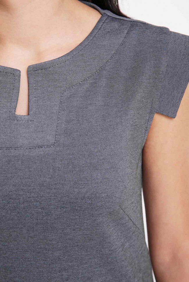 Платье приталенного кроя, без рукавов с крылышками, воротник фигурный с отсрочками, спереди внизу двойные складки, сзади по центру молния 50 см. Длина по спинке: 86 см Длина по полочке: 80 см