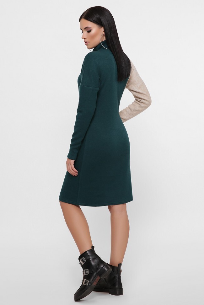 Теплое двухцветное платье свободного кроя с высоким воротником и рукавами "летучая мышь". В платье скомбинированы два цвета: темно-зеленый и бежевый. Замеры в (42) размере: длина платья 88 см, длина рукава 69 см.