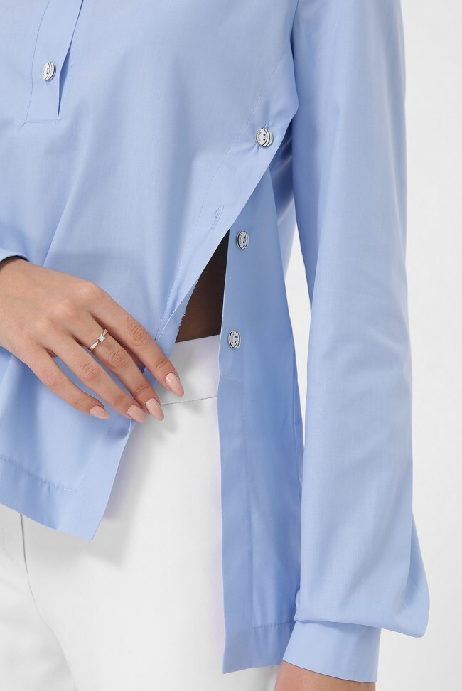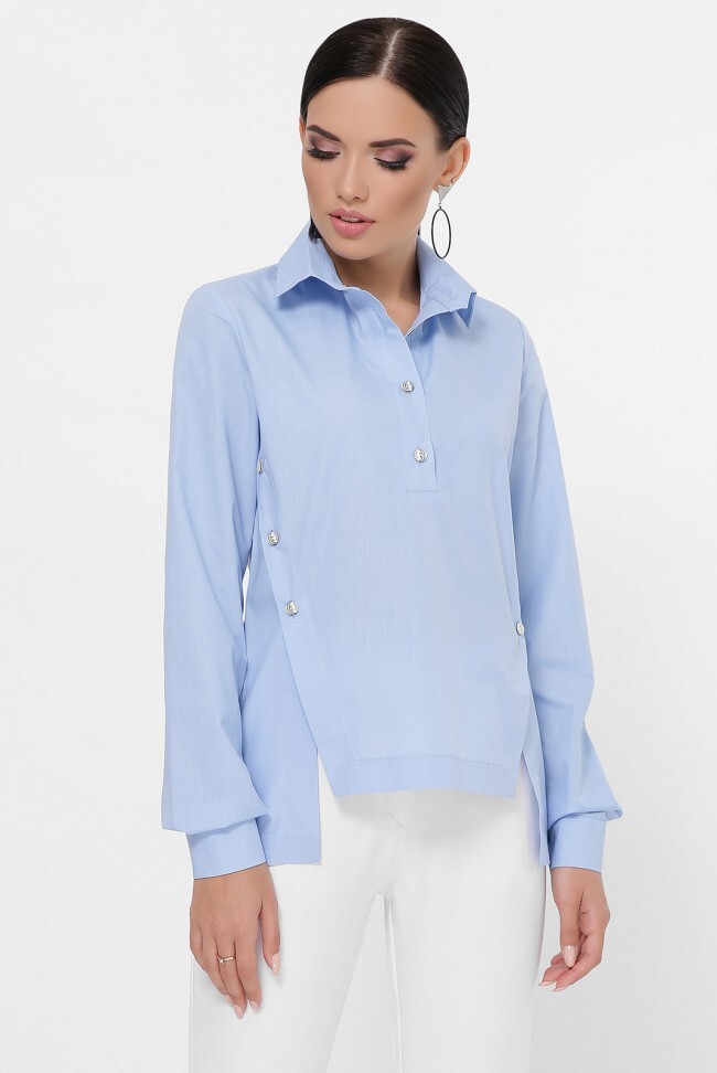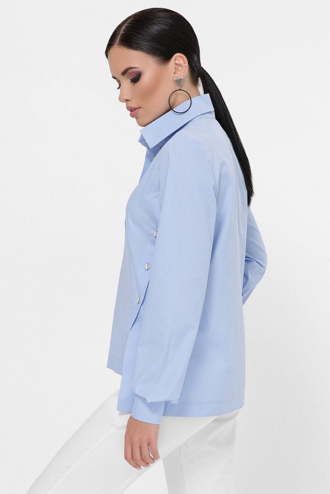 Голубая асимметричная рубашка с застегивающимися разрезами по бокам. Женская модель свободного кроя с фигурной передней полочкой, застегивается на четыре пуговицы сверху. Рубашка одевается через голову. Замеры в (42) размере: длина по спинке 64 см, по полочке 58 см, длина рукавов с манжетой 54 см, ширина манжета 5 см, полуобхват груди 48 см.