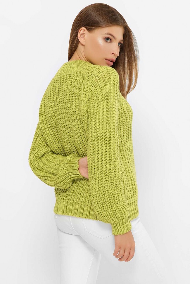 Женский молодежный джемпер фисташкового цвета, выполнен в крупной вязке с фактурным рисунком "коса" - по центру полочки. Рукав реглан. Замеры в (42-46) размере: длина по спинке 55 см, длина рукава 68 см.