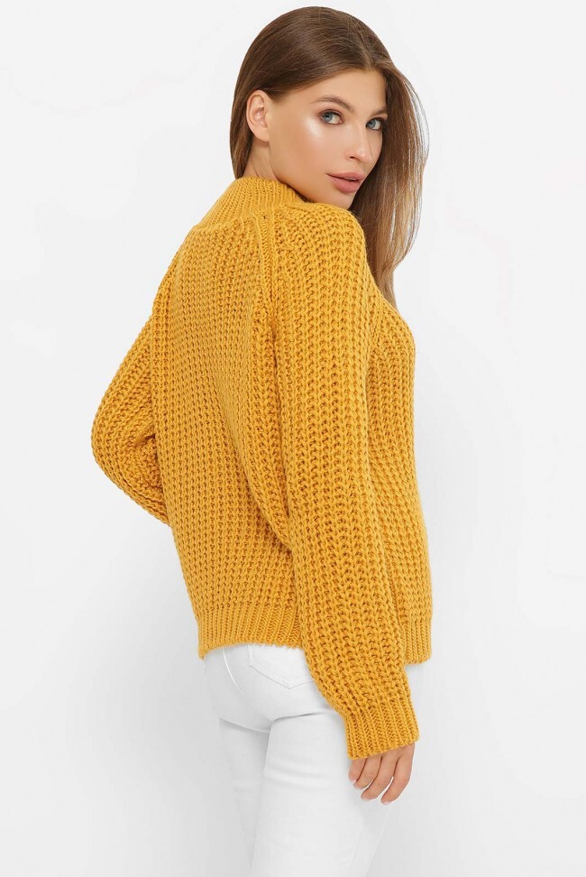Женский молодежный джемпер карамельного цвета, выполнен в крупной вязке с фактурным рисунком "коса" - по центру полочки. Рукав реглан. Замеры в (42-46) размере: длина по спинке 55 см, длина рукава 68 см.