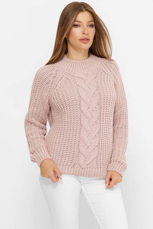 Женский джемпер пудрового цвета с люрексом, выполнен в крупной вязке с фактурным рисунком "коса" по центру полочки. Рукав реглан. Замеры в (42-46) размере: длина по спинке 55 см, длина рукава 68 см.