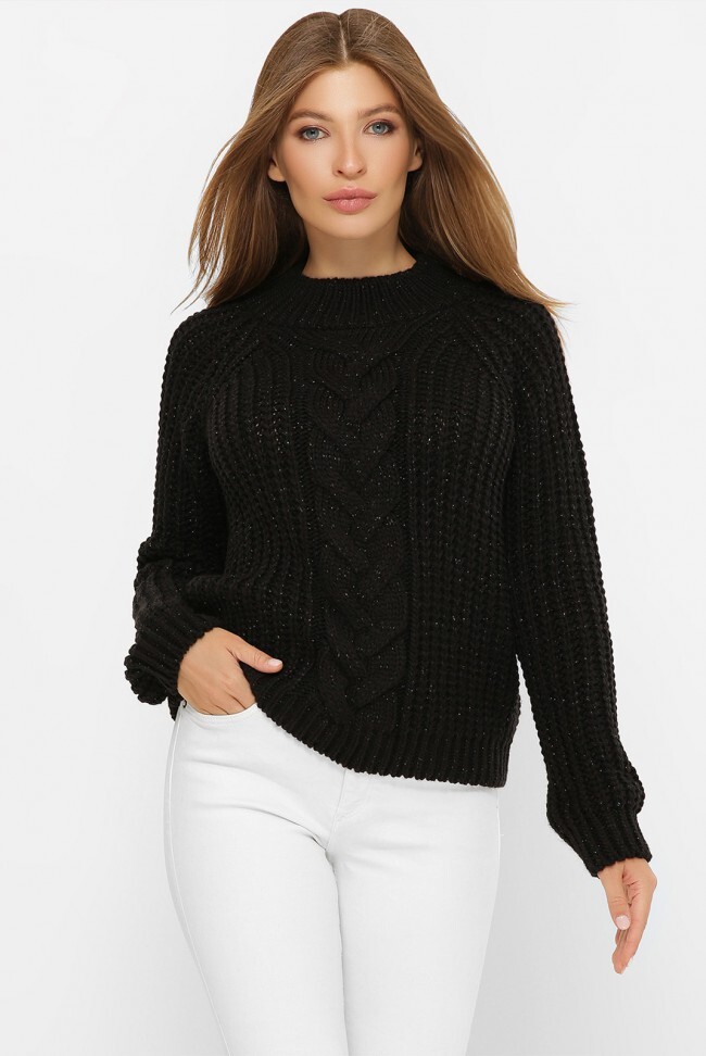 Женский джемпер черного цвета с люрексом, выполнен в крупной вязке с фактурным рисунком "коса" по центру полочки. Рукав реглан. Замеры в (42-46) размере: длина по спинке 55 см, длина рукава 68 см.