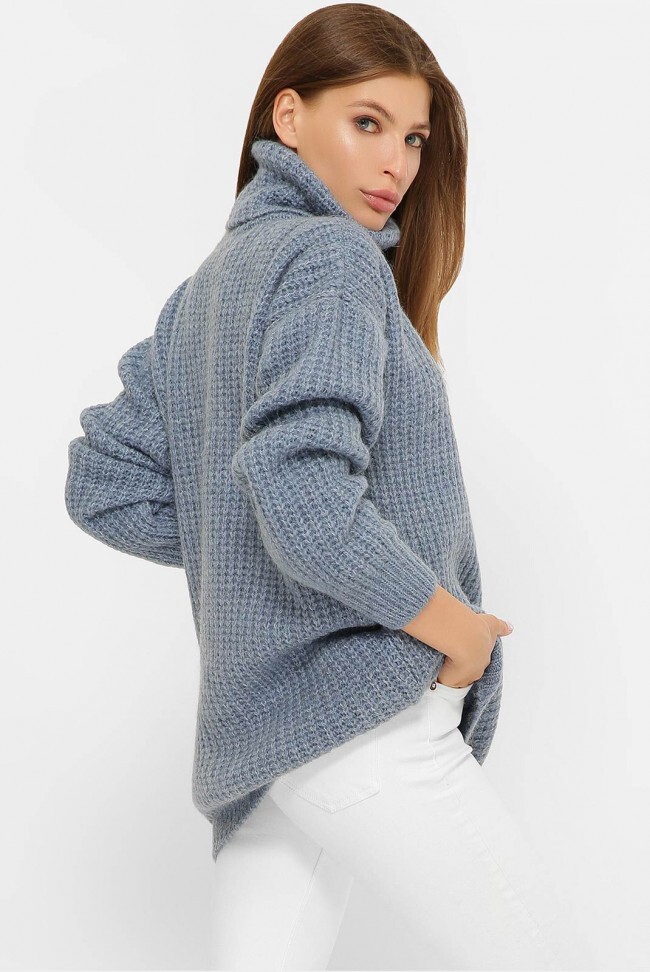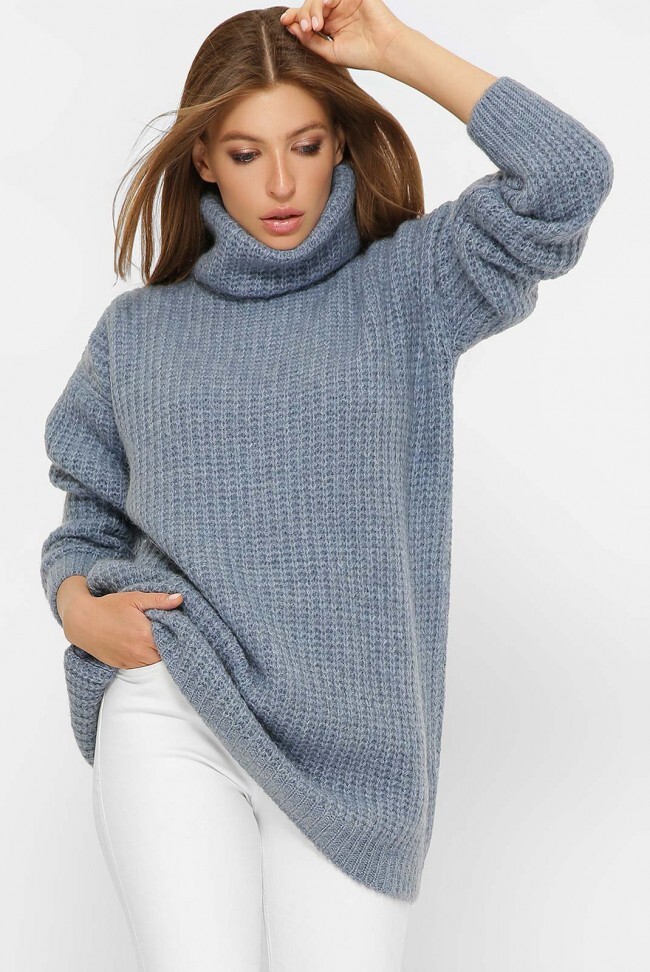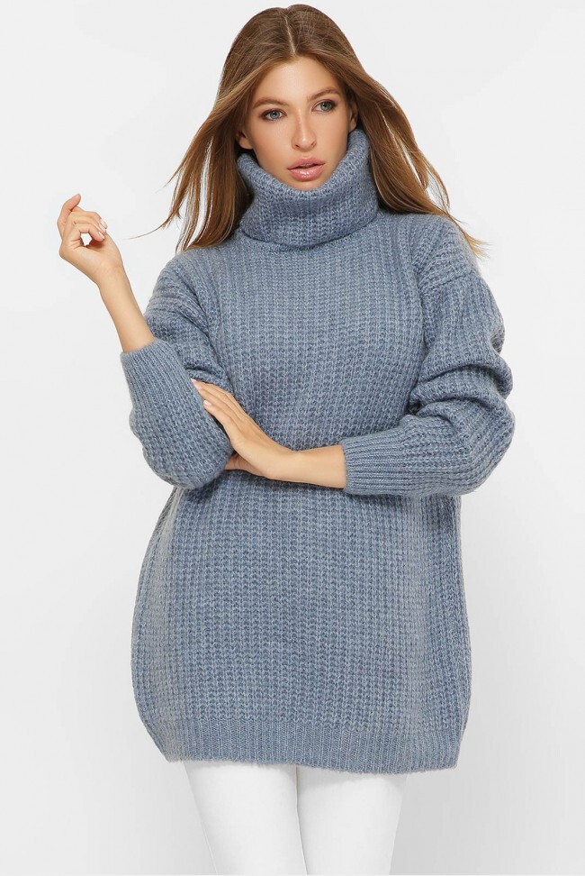 Вязаная свитер-туника джинсового-синего цвета с высоким горлом. Теплая женская модель из полушерстяной пряжи в едином универсальном размере. Замеры в (42-50) размере: длина по спинке 67-73 см, длина рукава 48-52 см, высота воротника 25 см.
