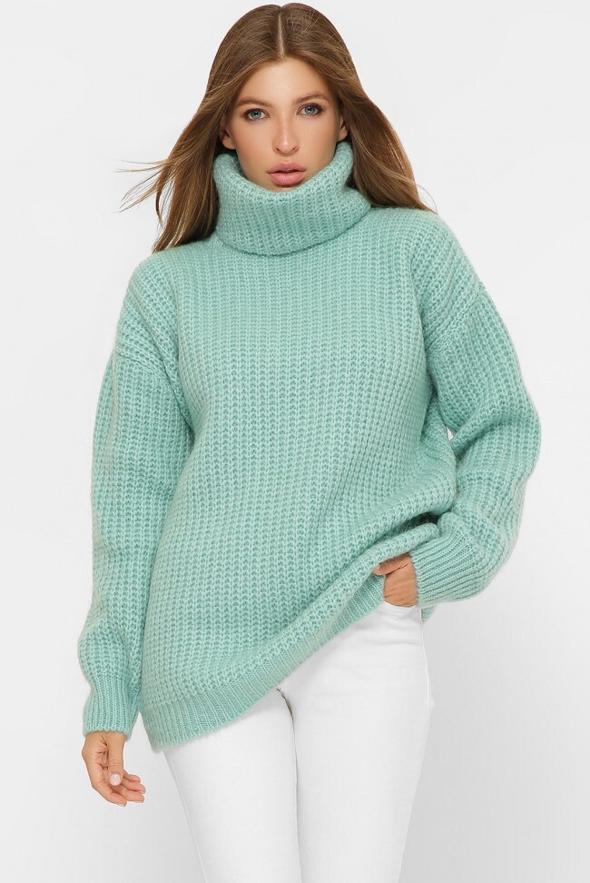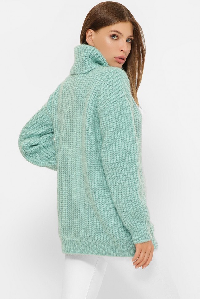 Мятная вязаная свитер-туника с высоким горлом. Теплая женская модель из полушерстяной пряжи в едином универсальном размере. Замеры в (42-50) размере: длина по спинке 67-73 см, длина рукава 48-52 см, высота воротника 25 см.