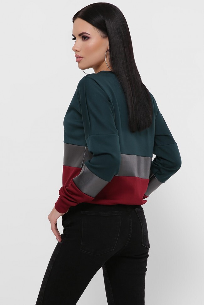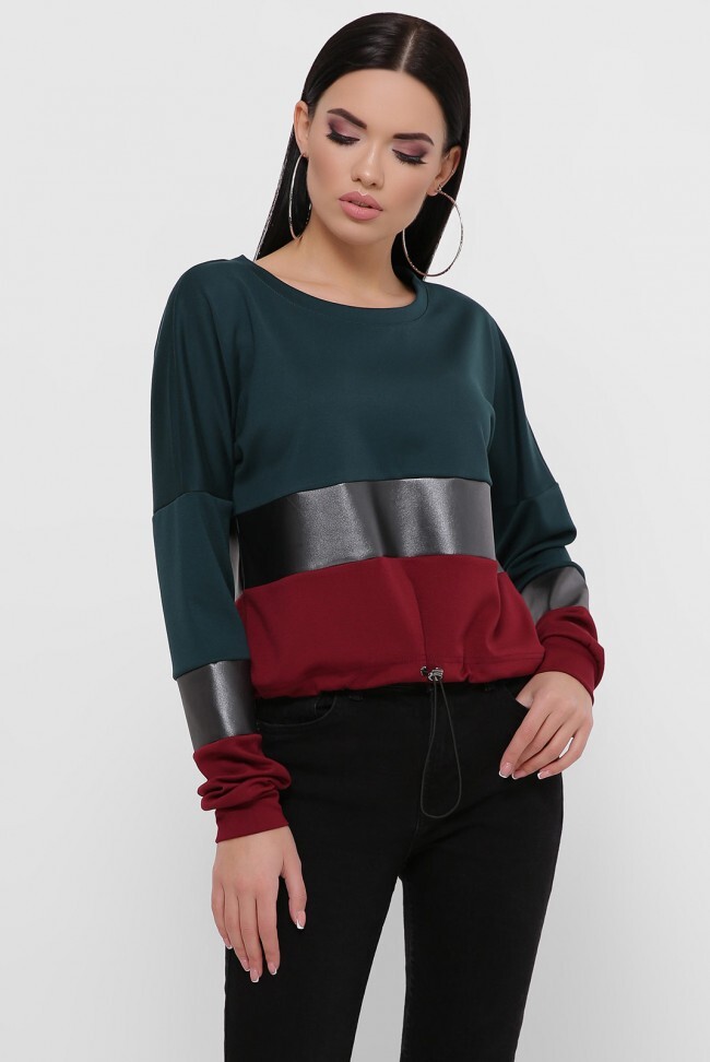 Трехцветный женский свитшот с кулиской. Модель свитшота с укороченной длинной. В свитшоте скомбинированы три цвета: темно-зеленый, графит и бордовый. Замеры в (42) размере: длина свитшота 51 см, длина рукава (от спущенного шва) 43 см, манжета 6 см, средняя вставка из экокожи шириной 8 см.