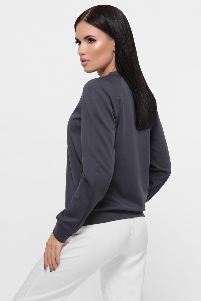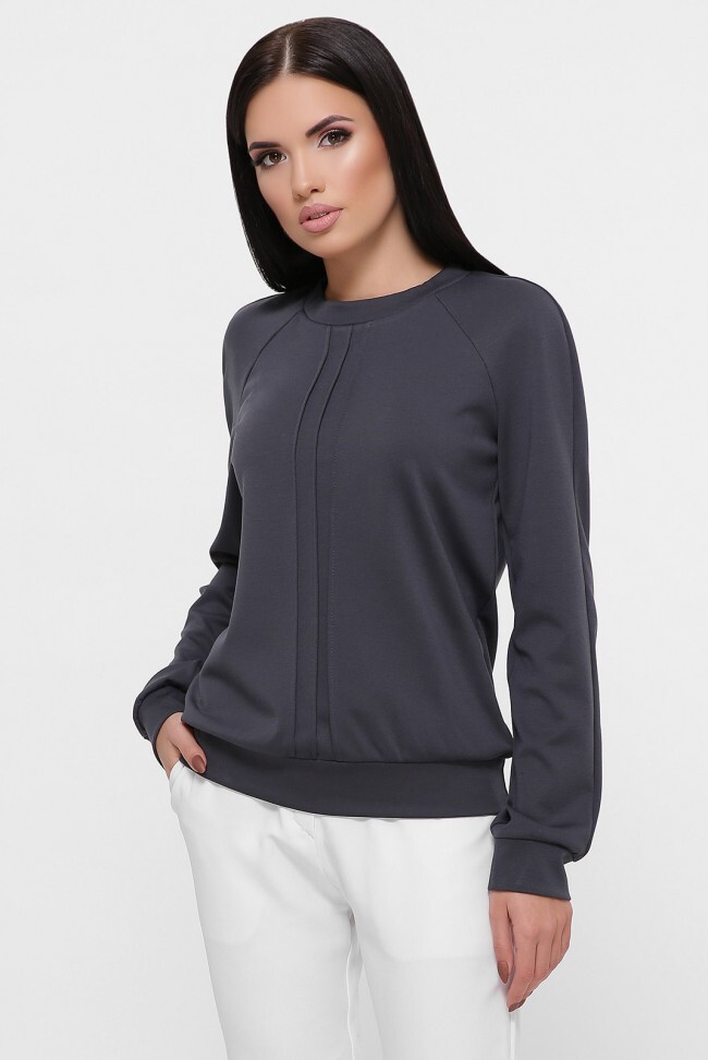 Оригинальный темно-серый свитшот на все случаи жизни. Спереди заложены три декоративные складки вдоль передней полочки, рукав реглан. Замеры в (42) размере: длина свитшота 61 см, длина рукава от горловины 69 см, ширина манжет 6 см.