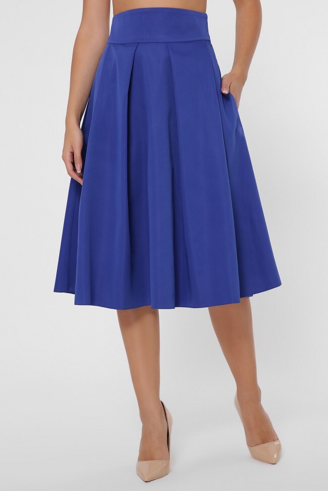 Симпатичная юбка - клеш. Спереди и сзади заложены встречные склады. Пояс широкий, по переду фигурный. В боковых швах врезные карманы. Сзади потайная молния - 22 см Длина юбки с поясом - 73 см Ширина пояса сзади - 7 см Ширина пояса спереди - 8 см