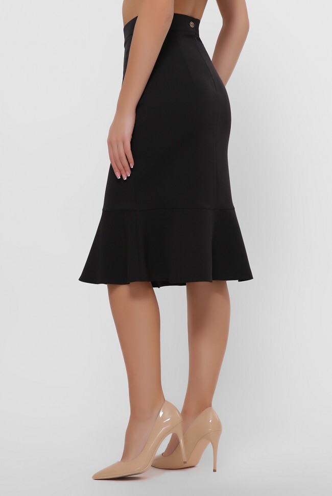 Прямая черная юбка с широкой оборкой (рюшей) снизу. Спереди и сзади вытачки, ширина рюши 19 см, сзади юбки потайная молния - 16 см. Замеры в (42) размере: длина юбки 66 см, ширина пояса 4 см, полуобхват по талии 33 см, полуобхват по бедрам 45 см.