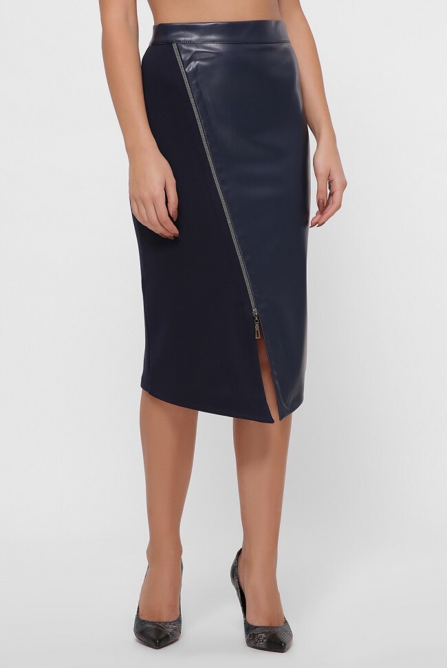 Ассиметричная комбинированная юбка темно-синего цвета. Модель из двух видов ткани - трикотаж джерси и экокожи. Ткани разделяет рабочая молния, сзади потайная молния 16 см. Юбка длины миди. Замеры в (42) размере: длина по переду 71 см, длина сзади 67 см, молния спереди 50 см, полуобхват по бедрам 42 см.