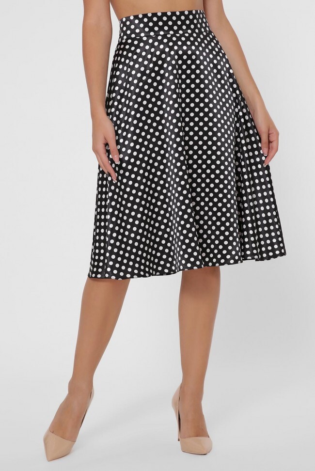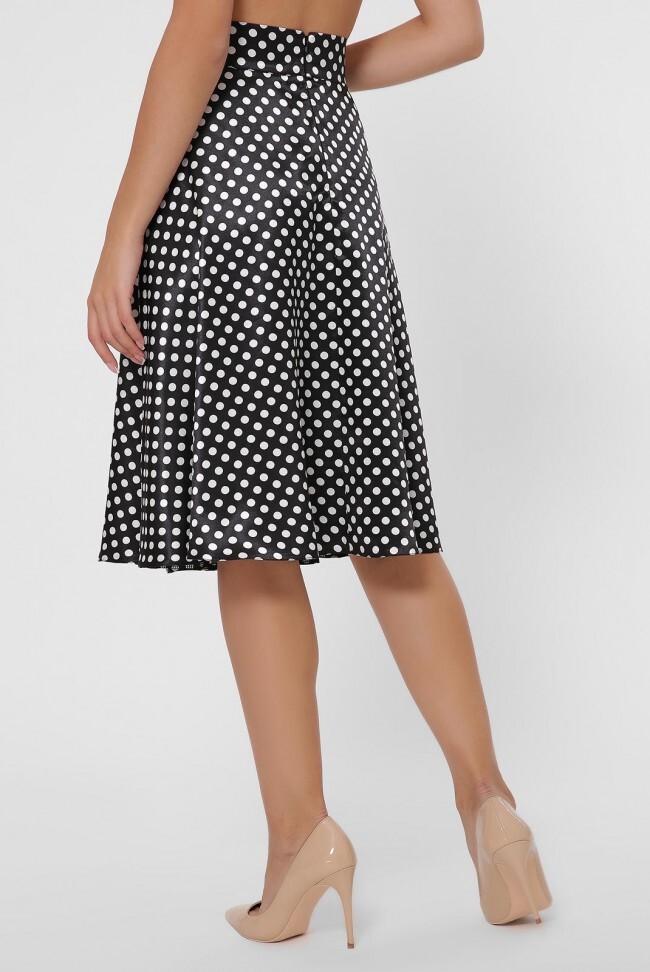 Легкая, струящаяся атласная юбка - клеш в горошек. Сзади потайная молния - 22 см Длина юбки с поясом - 66 см Ширина пояса - 6 см