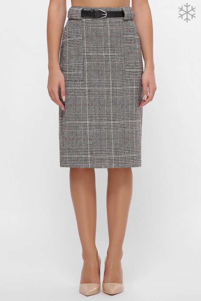 Теплая юбка с принтом "квадраты гусиная лапка" на сером фоне, из мягкого твида. Спереди накладные карманы, на поясе шлевки для ремня, сзади шлица 15 см. Ремень не в комплекте ! Замеры в (42) размере: длина с поясом 65 см, ширина пояса 5 см, полуобхват по бедрам 45 см, полубхват пояса 35 см.