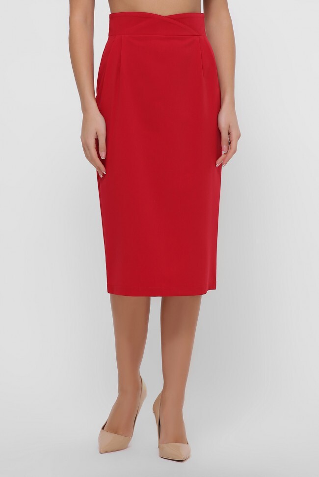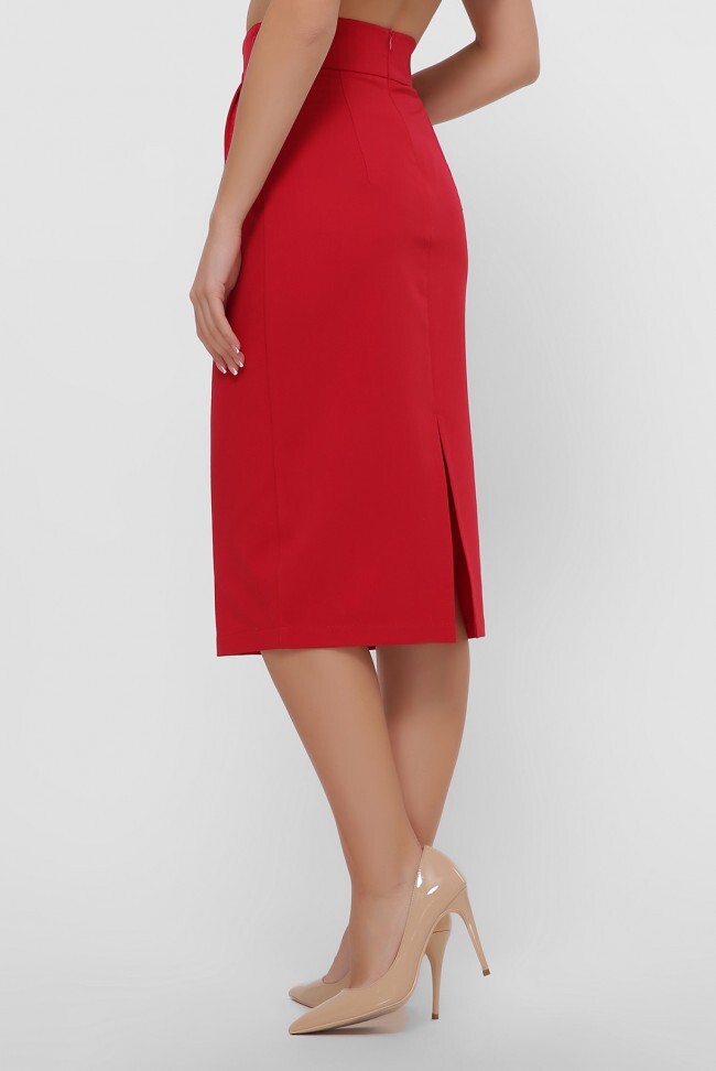 Красная юбка миди, зауженная к низу, с оригинальным поясом. По переду в талии заложены склады и декоративный пояс внахлест. Сзади по спинке вытачки и разрез, а также потайная молния 17 см. Замеры в (42) размере: длина юбки 74 см, ширина пояса 6 см, полуобхват по талии 33 см, полуобхват по бедрам 46 см, глубина разреза 27 см.