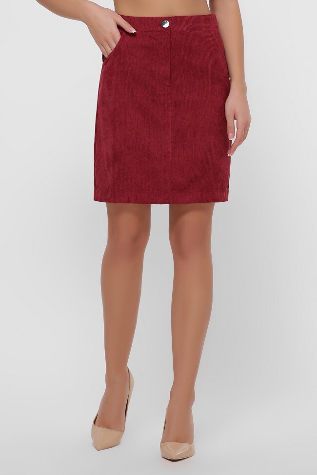 Вельветовая юбка мини бордового цвета. Спереди по бокам юбки врезные карманы, по спинке вытачки и два накладных кармана, а также маленький разрез. Замеры в (42) размере: длина юбки 47 см, ширина пояса 4 см, полуобхват по талии 36 см, полуобхват по бедрам 45 см, молния спереди 12 см, глубина разреза 7 см.