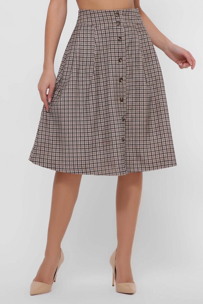 Свободная юбка миди в серую клетку на пуговицах. По переду планка с рабочими пуговицами, по бокам врезные карманы. Замеры в (42) размере: длина юбки 65 см, полуобхват по талии 36 см, ширина пояса сзади 6 см, ширина пояса спереди 7 см.