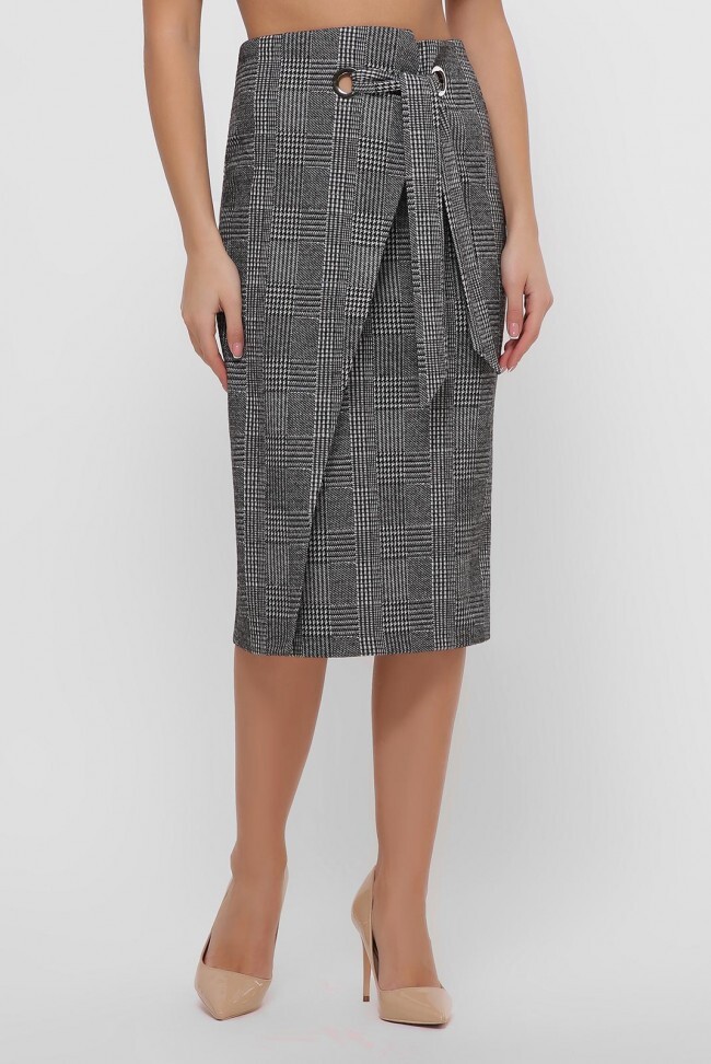 Кашемировая юбка на запах в черную клетку с хольнитенами. Пояс-завязка съемный. По спинке вытачки и разрез 26 см. Замеры в (42) размере: длина юбки 70 см, полуобхват по талии 37 см, полуобхват по бедрам 43 см, длина пояса-завязки 100 см, молния сзади 16 см.