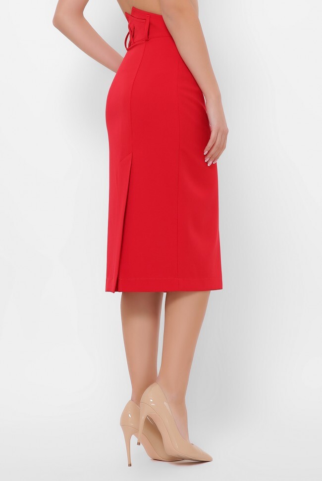 Красная юбка-миди зауженная к низу из костюмной ткани. Юбка имеет глубокий боковой разрез сзади и оригинальный фигурный пояс. Замеры в (42) размере: длина юбки 72 см, полуобхват по талии 33 см, полуобхват по бедрам 44 см, разрез 27 см.