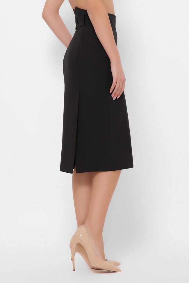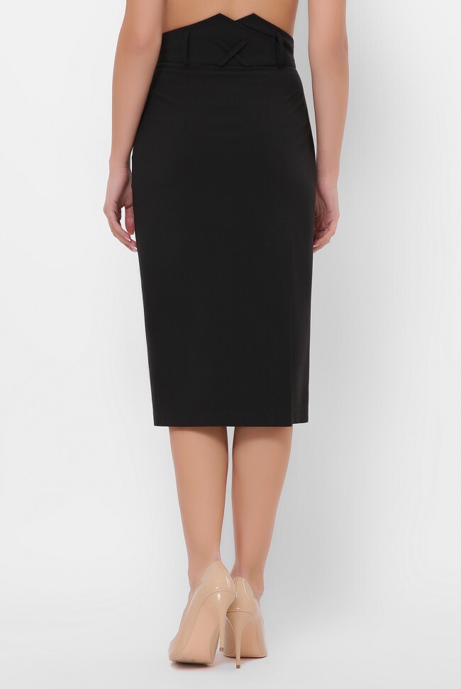 Черная юбка-миди зауженная к низу из костюмной ткани. Юбка имеет глубокий боковой разрез сзади и оригинальный фигурный пояс. Замеры в (42) размере: длина юбки 72 см, полуобхват по талии 33 см, полуобхват по бедрам 44 см, разрез 27 см.