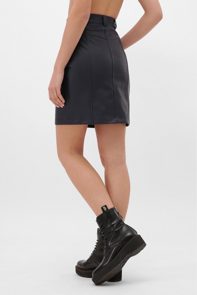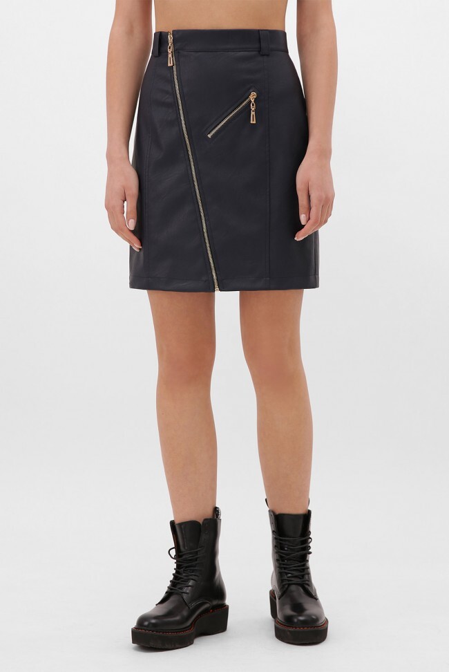 Кожаная юбки-мини темно-синего цвета с косой молнией по всей длине. Замеры в (42) размере: длина юбки 47 см, длина молнии спереди 50 см, полуобхват по талии 36 см, полуобхват по бедрам 45 см.