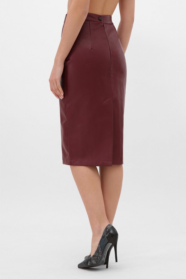 Женская элегантная юбка прямого кроя из плотной экокожи бордового цвета. Замеры в (42) размере: длина юбки 68 см, полуобхват по талии 35 см, полуобхват по бедрам 43 см.
