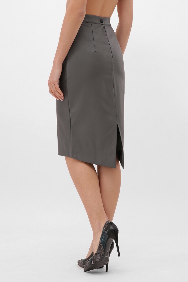 Элегантная юбка прямого кроя из экокожи серого цвета сзади с разрезом. Замеры в (42) размере: длина юбки по переду 64 см, длина юбки сзади 69 см, полуобхват по талии 35 см, полуобхват по бедрам 43 см.